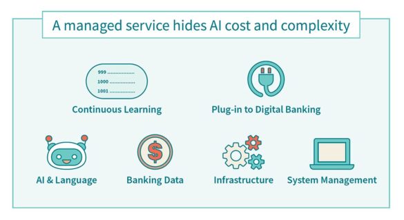 A managed service combines all the technical components of a full AI solution into a subscription package, eliminating the need to invest in AI training, infrastructure, ongoing learning, and integrations to systems like digital banking.